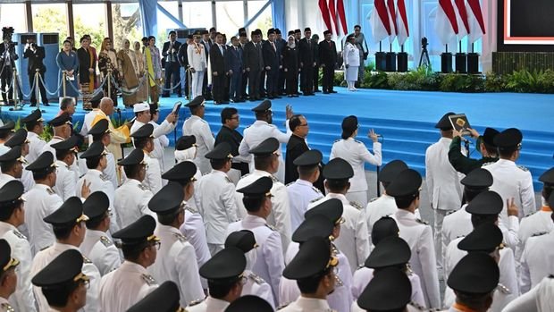 Presiden Prabowo Subianto melantik 961 kepala daerah yang terdiri dari 33 gubernur dan 33 wakil gubernur, 363 bupati, 362 wakil bupati, 85 wali kota, dan 85 wakil wali kota dalam upacara tersebut. (ANTARA FOTO/Aditya Pradana Putra) |
