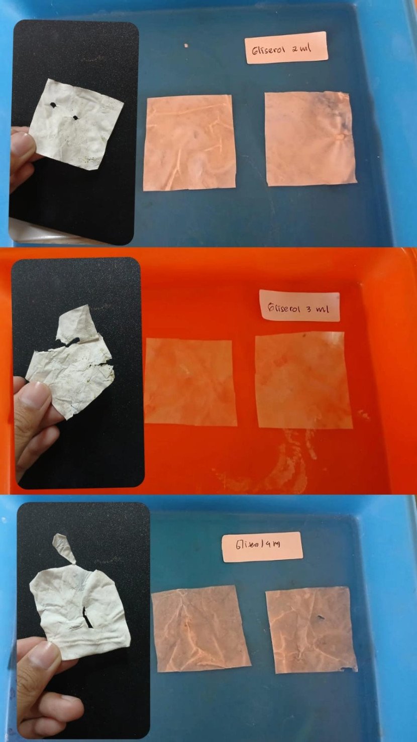 Hasil penelitian menunjukkan bahwa bioplastik dengan variasi gliserol 16% memiliki laju degradasi tertinggi (8,6% per hari), sementara 12% memberikan ketahanan air terbaik (87,87%).