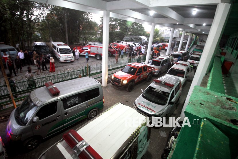 Sejumlah mobil ambulance disiapkan untuk korban bangunan musala yang ambruk di Pondok Pesantren (Ponpes) Al Khoziny di Kecamatan Buduran, Sidoarjo, Jawa Timur, Senin (29/9/2025). Belum diketahui jumlah korban yang yang tertimbun akibat ambruknya bangunan tersebut.