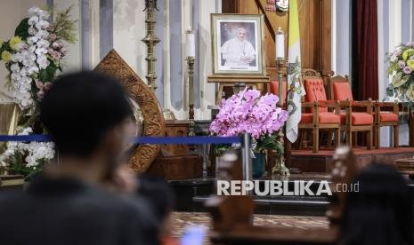 REPUBLIKA.CO.ID, Umat Katolik berdoa di dekat foto Paus Fransiskus sebelum mengikuti misa harian di Gereja Katedral, Jakarta, Senin (21/4/2025).