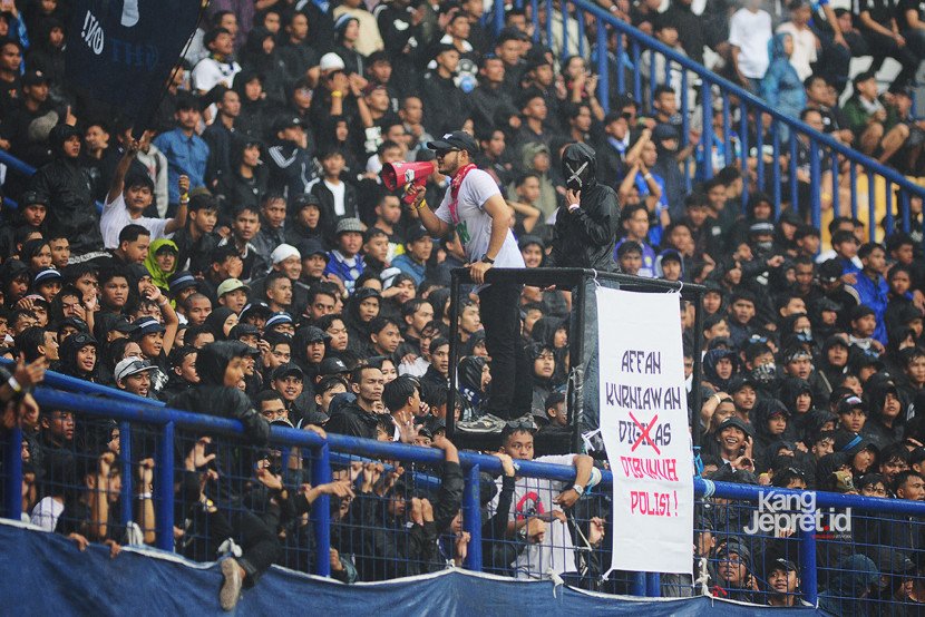 Selain mendukung tim Persib, suporter di bagian tribun utara menyanyikan chant dan poster memprotes peristiwa meninggalnya pengemudi ojek onlone Affan Kurniawandi Stadion Gelora Bandung Lautan Api pada Jumat (12/9/2025) sore WIB. (KANGJEPRET.ID/ YOGI ARDHI) (Data: Nikon D700, Nikkor MF 300/2.8)