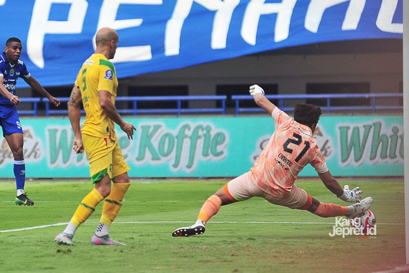 Kiper Persebaya Surabaya Ernando Ari Sutaryadi berusaha memhalau bola tendangan striker Persib Bandung Uilliam Barros dilanggar Persebaya Surabaya berebut bola pada laga ke-4 BRI Superleague pekan ke-4 di Stadion Gelora Bandung Lautan Api pada Jumat (12/9/2025) sore WIB. (KANGJEPRET.ID/ YOGI ARDHI) (Data: Nikon D700, Nikkor MF 300/2.8)