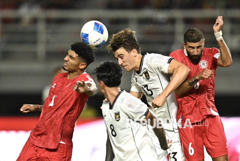 Indonesian national team footballer Mauro Nils Zijlstra (second right) fights for the ball with Lebanese national team footballer Hussein Sharafeddine (left) during the FIFA Matchday at Gelora Bung Tomo Stadium, Surabaya, East Java, Monday (8/9/2025).