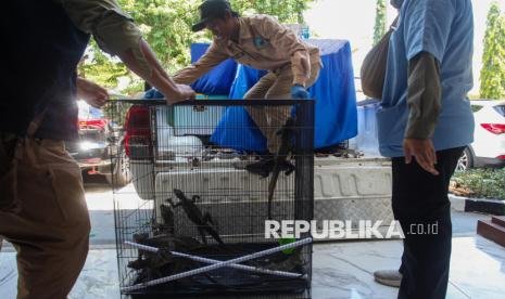 REPUBLIKA.CO.ID, SURABAYA — Barang bukti Komodo (Varanus Komodoensis) berada di dalam sangkar saat ungkap kasus perdagangan satwa di Polda Jawa Timur, Surabaya, Jawa Timur, Rabu (15/4/2026).
