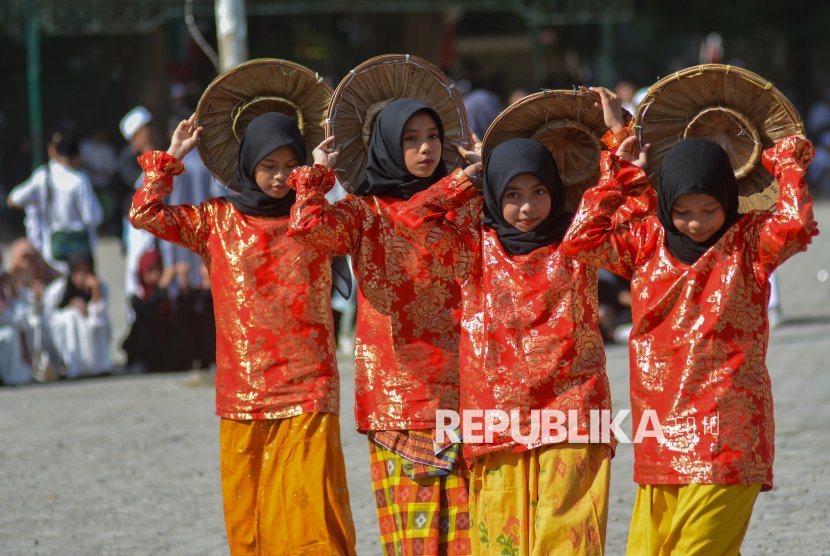 Sejumlah santri memainkan Tari Pamonte usai apel Hari Santri Nasional di Kompleks Perguruan Alkharaat Palu, Sulawesi Tengah, Rabu (22/10/2025). Hari Santri yang diperingati setiap 22 Oktober itu kali ini bertema Mengawal Indonesia Merdeka, Menuju Peradaban Dunia.