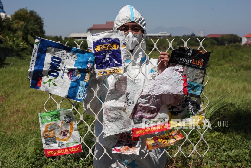 Seorang aktivis lingkungan dari Ecoton membawa sampah plastik impor saat berunjuk rasa di depan Kantor Konsulat Jenderal Australia di Surabaya, Jawa Timur, Senin (19/8/2024).