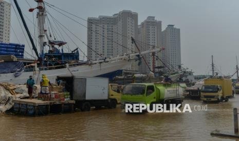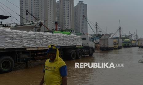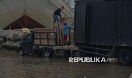 Pekerja beraktivitas saat banjir rob di kawasan Pelabuhan Sunda Kelapa, Jakarta Utara, Rabu (28/5/2025). Banjir rob setinggi sekitar 40 centimeter tersebut akibat kenaikan muka air laut pada malam hari, meski demikian warga menuturkan banjir di kawasan tersebut merupakan banjir permanen, lantaran kawasan tersebut mengalami penurunan muka tanah serta saluran drainase yang tersumbat. Kondisi tersebut dapat menghambat aktivitas warga dan pekerja saat aktivitas bongkar muat logistik. (FOTO : Republika/Thoudy Badai)