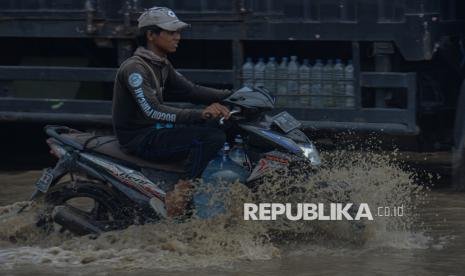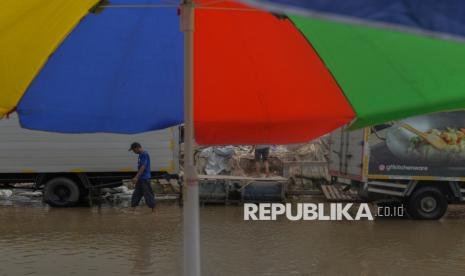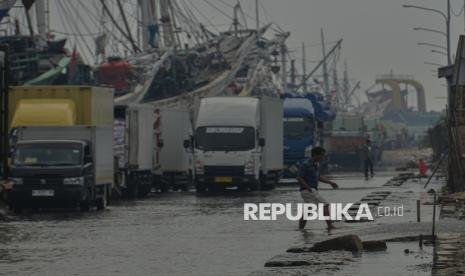 Kendaaran truk melintas menerobos genangan banjir rob di kawasan Pelabuhan Sunda Kelapa, Jakarta Utara, Rabu (28/5/2025). Banjir rob setinggi sekitar 40 centimeter tersebut akibat kenaikan muka air laut pada malam hari, meski demikian warga menuturkan banjir di kawasan tersebut merupakan banjir permanen, lantaran kawasan tersebut mengalami penurunan muka tanah serta saluran drainase yang tersumbat. Kondisi tersebut dapat menghambat aktivitas warga dan pekerja saat aktivitas bongkar muat logistik. (FOTO : Republika/Thoudy Badai)