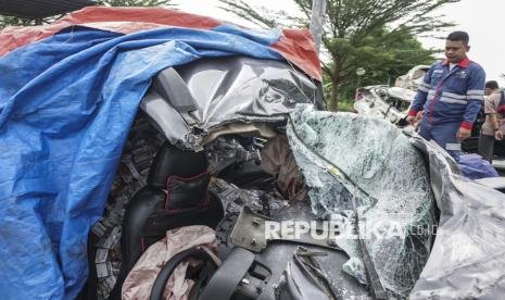 Petugas tol Pemalang Batang Tol Road (PBTR) menunjukkan barang bukti mobil yang ringsek di Gerbang Exit Tol Bojong, Kabupaten Pekalongan, Jawa Tengah, Sabtu (12/4/2025). Kecelakaan yang melibatkan mobil yang diduga membawa rokok ilegal tanpa cukai dengan bus berpenumpang rombongan suporter tim Persebaya Surabaya tersebut mengakibatkan pengemudi mobil kritis dan satu korban penumpang mobil meninggal dunia. (FOTO : ANTARA FOTO/Harviyan Perdana Putra)