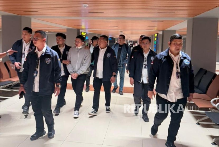 Penampakan Adimas Firdaus alias Resbob (kedua dari kiri) saat digelandang aparat kepolisian di Bandara Soekarno Hatta usai diamankan di Semarang, Jawa Tengah, Senin (15/12/2025).