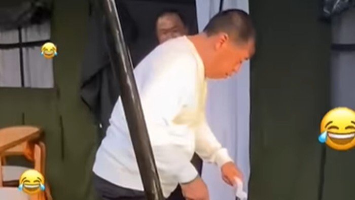 Tak hanya itu, tampak pula kepala daerah tengah bersantai sejenak di halaman tenda sambil mengenakan kaus kutang, salah satunya Wali Kota Surabaya Eri Cahyadi. Melihat tendanya disambangi Bima, Eri tampak lari terbirit-birit masuk ke tendanya.