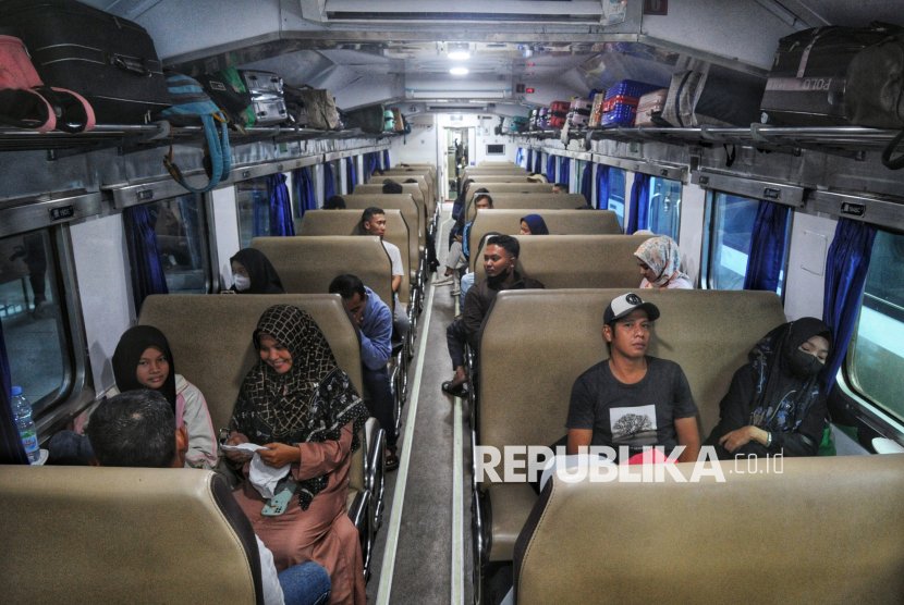 Pemudik berada dalam kereta di Stasiun Pasar Senen, Jakarta, Sabtu (29/3/2025). Pada H-2 lebaran keramaian pemudik masih berlangsung di Stasiun Pasar Senen. Beberapa pemudik tampak membawa banyak barang, seperti tas dan kardus berisi makanan atau pakaian. KAI mencatat sebanyak 27.934 penumpang berangkat mudik dari Stasiun Pasar Senen, pada H-2 Lebaran.